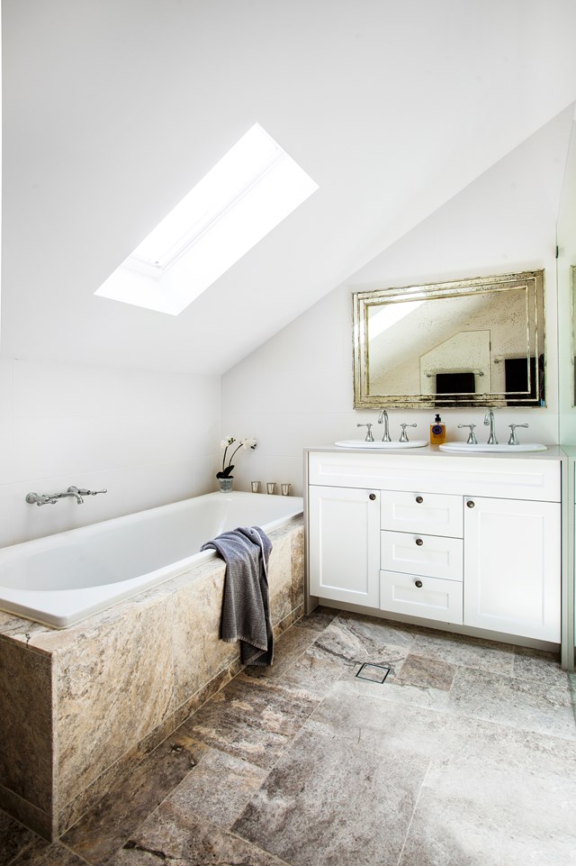 Trong quá trình cải tạo ngôi nhà có từ những năm 1930 này, những người chủ đã chuyển đổi tầng áp mái thành một phòng tắm sang trọng. Họ chọn một bồn tắm được đóng khung bằng gạch travertine. Để tạo sự thú vị cho thị giác, những viên gạch được cắt theo nhiều kích cỡ khác nhau và được lát theo phong cách truyền thống của Pháp.