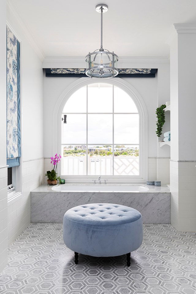 Đặt bên dưới một cửa sổ hình vòm quá khổ, ấn tượng, một chiếc bồn tắm được ốp đá tự nhiên - đá marble lặng lẽ neo giữ phòng tắm kiểu Hamptons sang trọng này. Viền xung quanh bằng đá tự nhiên - đá marble và giá đỡ có mái vòm cung cấp vô số phạm vi để tạo kiểu.