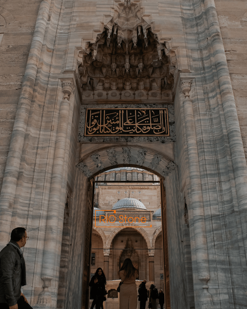 Như với tất cả các nhà thờ Hồi giáo hoàng gia ở Istanbul, lối vào nhà thờ Hồi giáo có một khu tiền cảnh với một đài phun nước trung tâm. Mặt tiền bên ngoài của nhà thờ Hồi giáo được trang trí bằng các ô cửa sổ lát gạch Iznik màu xanh lam hình chữ nhật.