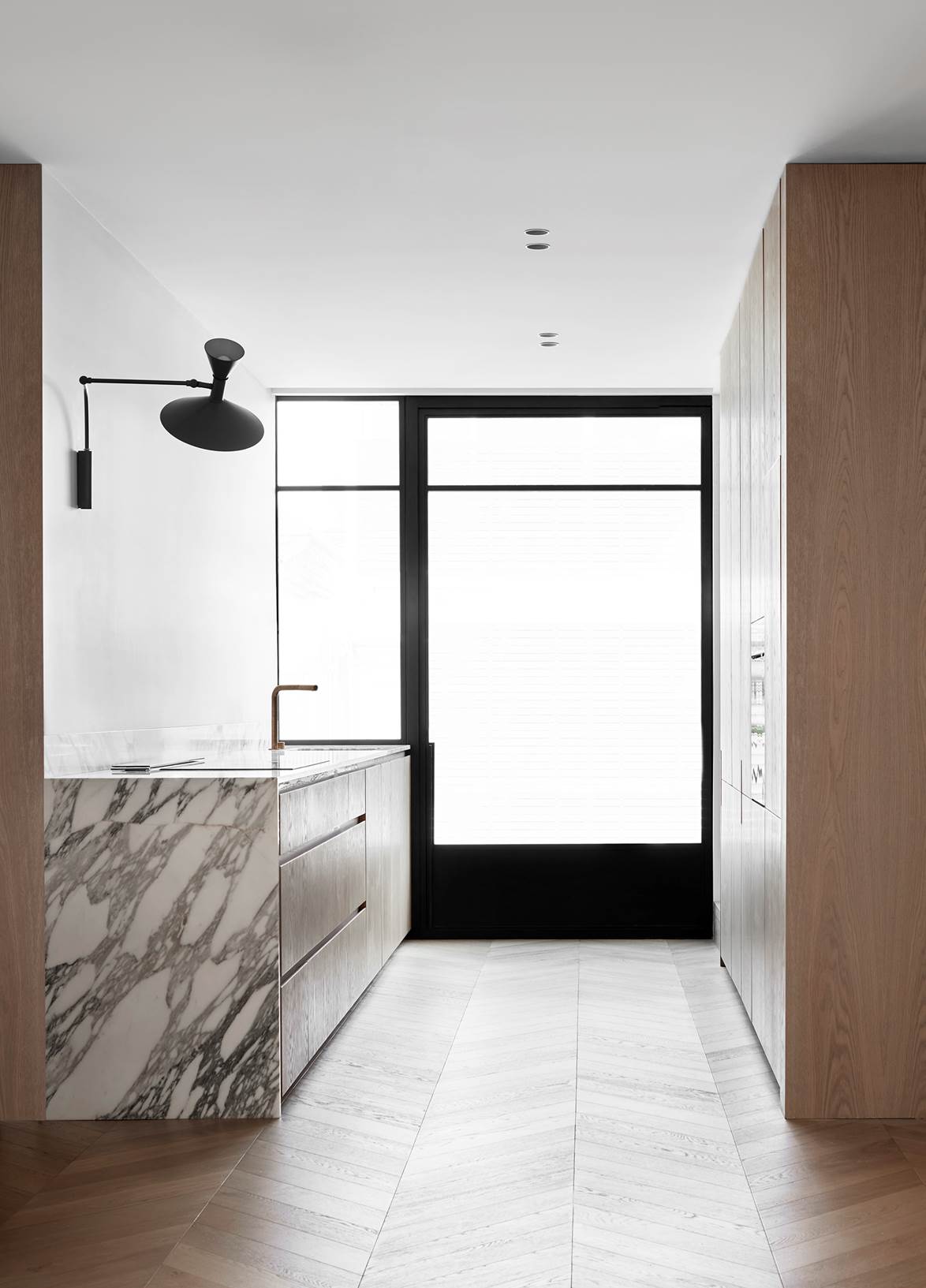 Không gian tối giản do Travis Walton hình thành đã cập nhật triệt để căn bếp theo phong cách theo chủ nghĩa hiện đại. "Chúng tôi đã áp dụng một cách tiếp cận mới cho việc tân trang này để tối đa hóa không gian và tạo ra một sự sang trọng tinh tế. Chi tiết tối giản mang lại không gian thở lớn hơn, hòa giải nét đặc trưng của cái cũ với sự hạn chế của cái mới." Mặt đá bếp được lắp đặt bằng đá marble Arabescato