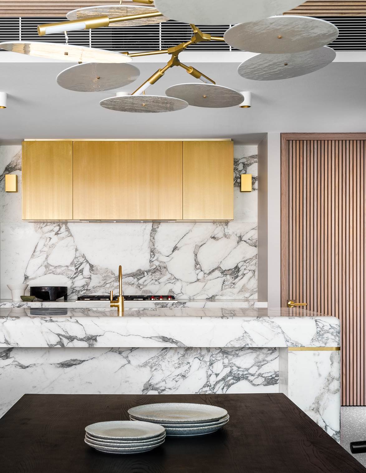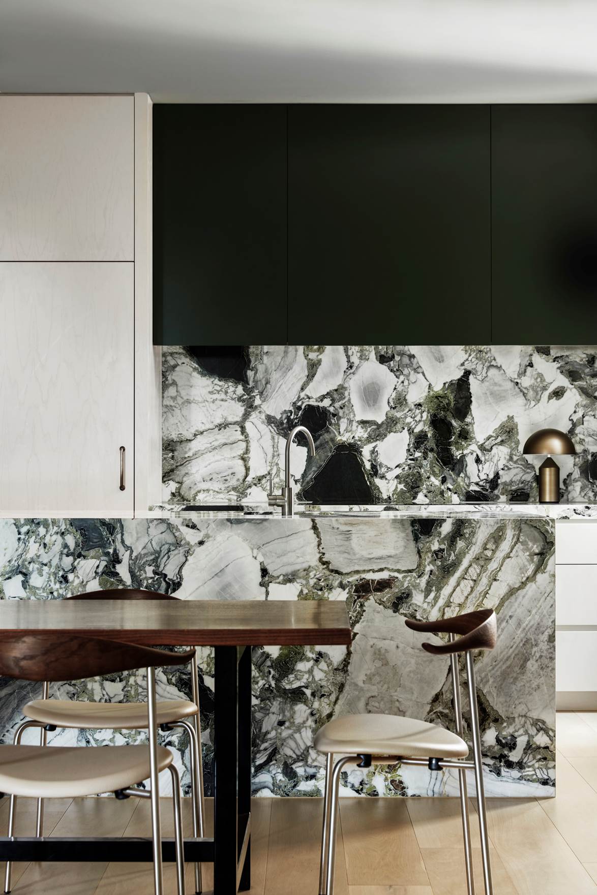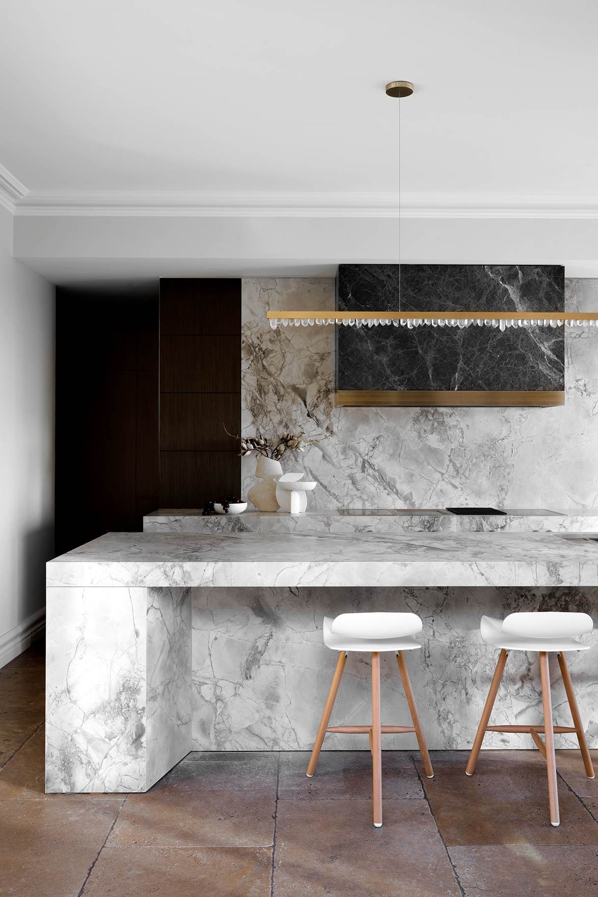 Nhà bếp 'trưng bày' đã được thực hiện lại trong ngôi nhà ba tầng lớn ở Mosman, Sydney, với các chi tiết bằng đá cẩm thạch và đồng. Băng ghế trên mặt đá bếp, một chiếc đèn mặt dây chuyền Christopher Boots 'Prometheus VII' của Est Lighting được treo.