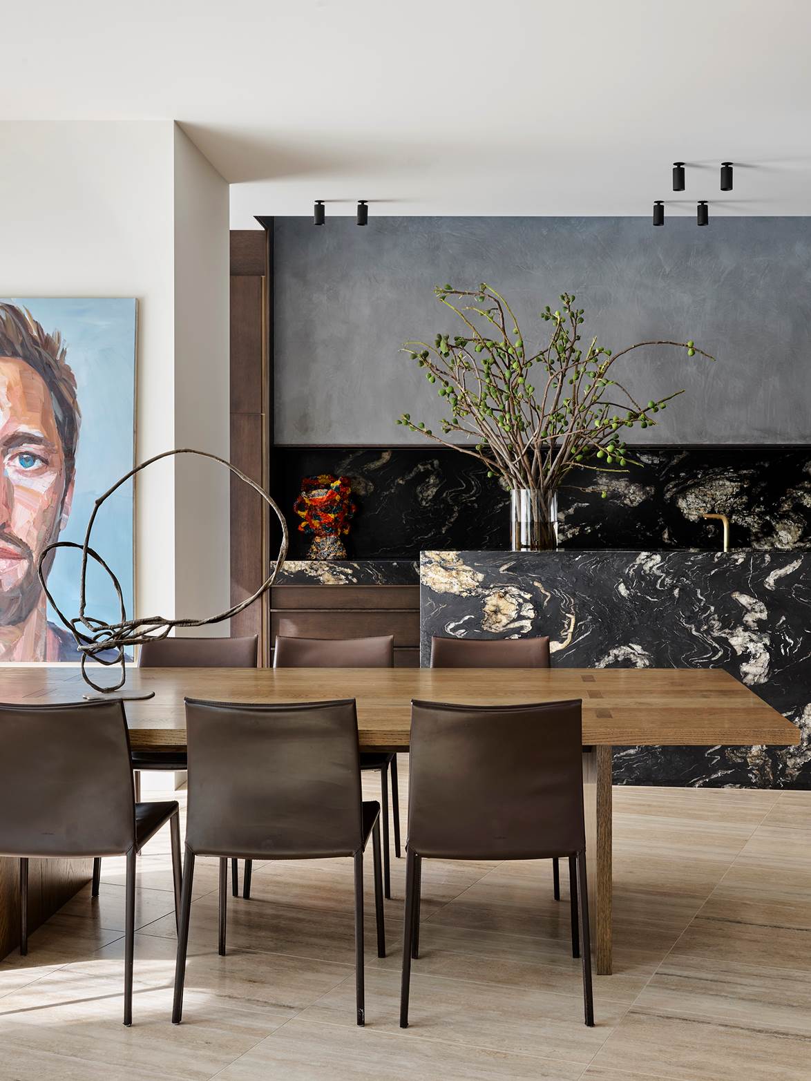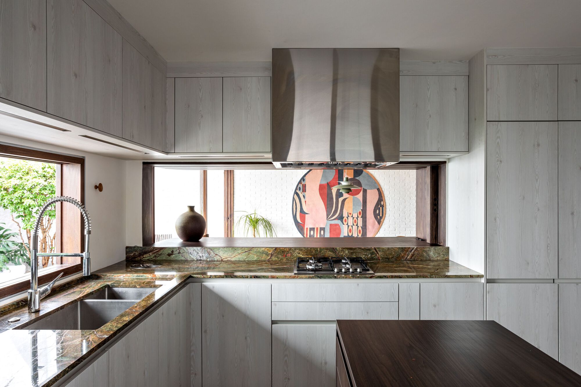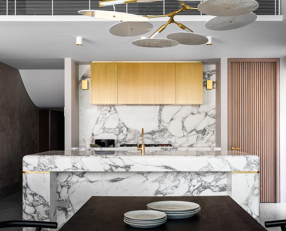 Nhà thiết kế Fiona Lynch đã sử dụng bảng màu trong căn hộ giống như ốc đảo này, lấy cảm hứng từ màu xanh lá mạ của cảnh quan. Đá marble hình băng xanh từ Signorino mang đến sự nổi bật cho đảo bếp và đá mặt bếp, giữ căn phòng như một tác phẩm nghệ thuật trừu tượng. Cân bằng với sự hạn chế sang trọng của các lớp hoàn thiện, bao gồm thạch cao đánh bóng và gỗ óc chó, nội thất là một thành phần tinh tế của các bề mặt xúc giác, tinh tế.
